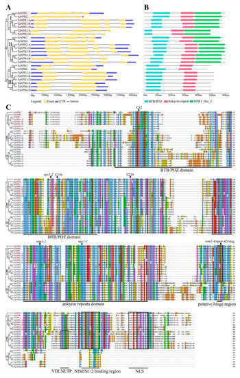 The sequence and structural features of TaNPR1-like genes further support the phylogenetic analysis. NPR1 homologs on the same clade of bread wheat and Arabidopsis share similar exon-intron structures (Figure 2A). Moreover, the structural organization of NPR1-like genes in clade I and II consisted of four exons and three introns, which were also conserved in other plant species, such as rice OsNPR1, OsNPR2, and OsNPR3 [51], barley HvNPR1 [55], Theobroma cacao TcNPR1 and TcNPR3 [61], and Persea americana PaNPR1, PaNPR2, and PaNPR4 [80]. This conservation across different species showed that the NPR1-like family was also conserved in the genomic structure.