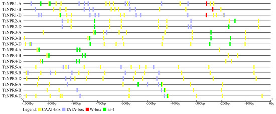 Analysis of potential cis-acting elements in the promoter regions of TaNPR1-like genes. The promoter regions (1000-bp upstream of the ATG translation start codon) of TaNPR1-like genes were used to analyze four specific SA-responsive cis-acting regulatory elements, including CAAT-box (yellow blocks), TATA-box (blue blocks), W-box (red blocks), and as-1 element (green blocks).