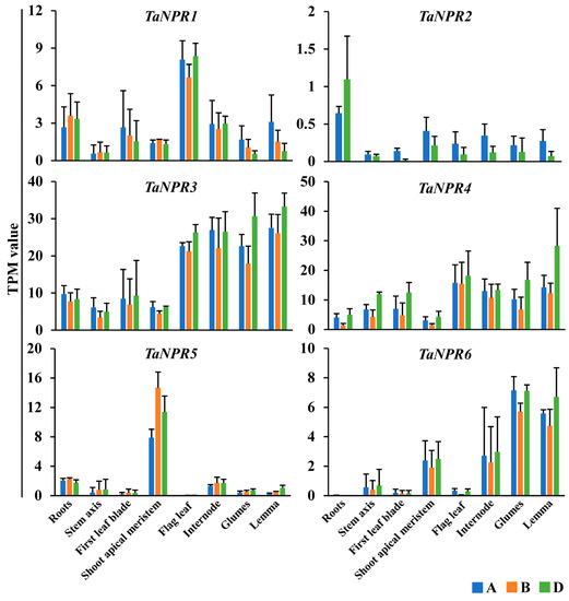 Expression profiles of TaNPR1-like genes across various tissues/organs by RNA-seq. The bread wheat tissues/organs at the seeding stage (roots, stem axis, first leaf blade, and shoot apical meristem) and reproductive stage (flag leaf blade, internode, glumes, and lemma) are marked on the horizontal axis. The unit of the y-axis is transcripts per kilobase million (TPM), and each TPM value of TaNPR1-like genes is the average of three biological replicates; error bars represent the SD.