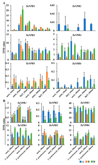 In spike tissue inoculated with mock or F. graminearum, TaNPR2-A/-D transcripts showed the lowest level (TPM < 0.2) in this family (Figure 6B). Only TaNPR1-A/-B/-D was up-regulated at 30 and 50 h after inoculation (hai) compared with the mock group. There was no significant difference in TaNPR3-A/-B/-D and TaNPR4-A/-B/-D between control and experimental groups at 30 and 50 hai. Moreover, TaNPR5-A/-B/-D and TaNPR6-A/-B/-D were slightly down-regulated at 30 and 50 hai. The results imply that TaNPR1-A/-B/-D may have similar functions as AtNPR1 and ScNPR1 in response to F. graminearum in bread wheat [65,66,67,68].