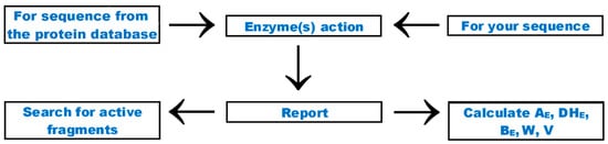 | New options available via the “enzyme(s) action” tab | New quantitative parameters describing possibility of release of bioactive peptides by proteolytic enzymes—Equations (5)–(7) in Table 5, option enabling finding enzyme with a given specificity among proteinases annotated in the database |
