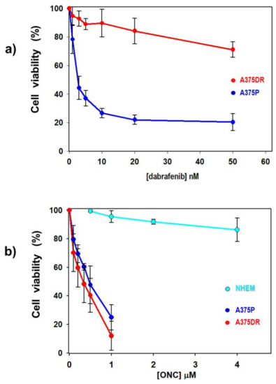 Effect of dabrafenib or onconase (ONC) on the viability of melanoma A375 and of normal human epidermal melanocytes (NHEM) cells. (a) A375P (blue dots) and A375DR (red dots) cell viability detected after 72 h incubation with increasing concentrations of dabrafenib. For each dabrafenib concentration tested (panel a), all A375P versus A375DR comparisons are statistically significant (see text). (b) cell viability of A375P (blue dots), A375DR (red dots), and NHEM (cyan dots) after 72 h incubation with increasing concentrations of ONC. Statistically significant differences are present (p < 0.0001) between NHEM versus A375P or A375DR cells, either at 0.5 or 1 µM ONC, while not between the two A375 cell subpopulations at all ONC concentrations tested. All values reported are the average of four to five independent experiments, each performed in six replicates, ± S.D.