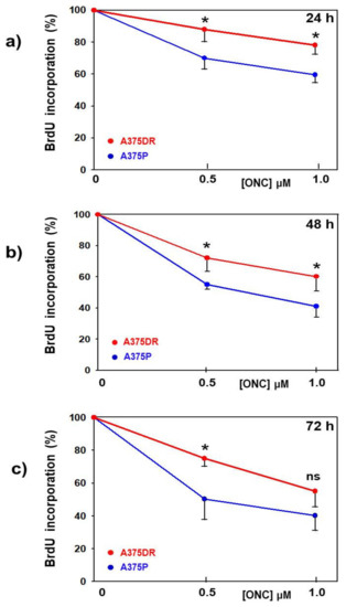 Effect of ONC in the proliferation rate of the two A375 cell subpopulations. (a) 24 h, (b) 48 h, and (c) 72 h measurement of cell proliferation performed with 5-Br-2’-deoxyuridine (BrdU) incorporation in A375P (blue dots) or A375DR (red dots) cells after being incubated with 0.5 or 1.0 µM ONC, in comparison with ONC-free controls. The BrdU data are normalized to each control sample to better visualize the lower reduction of the proliferation rate elicited by ONC in A375DR than in A375P cells. Values reported are the average of four independent experiments, each performed in triplicate, ± S.D. * p < 0.05; ns, not statistically significant.