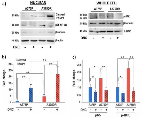 ONC effects in the amount of cleaved PARP1, nuclear p65, and the phosphorylation level of IκB kinases-α/β (p-IKK) in both A375 cell subpopulations. (a) Representative WB performed with antibodies recognizing PARP1, p65 in the nucleus and the p-IKK. The hybridization with β-tubulin of either the nuclear or the whole cell protein extractsWB membranes has been performed to exclude the cytosolic contamination in the nuclear extracts. β-actin expression levels were used as the internal control; (b) Fold-change for the quantification of the cleaved PARP1 WB bands detected after incubating both cell subpopulations (A375P, blue bars; A375DR, red bars) in the presence (diagonal hatched bars) or absence (no hatching) of ONC; and (c) Fold-change for the quantification of p65 nuclear localization and p-IKK WB bands detected after incubating both cell subpopulations in the presence or absence of ONC: Data reported, obtained after β-actin normalization, are the average of four independent WB experiments ± S.D. All differences registered in panels b and c between ONC-free and ONC-treated samples are statistically significant in both cell subpopulations. * p < 0.05, ** p < 0.01.