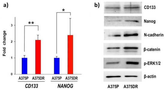 Expression levels of malignancy markers on A375DR versus A375P cells. (a) mRNA expression levels of CD133 and NANOG. Values were measured with RT-qPCR in ONC-free A375P (blue bars) and A375DR (red bars) cells, respectively. Average data ± S.D. refer to three independent experiments, each performed in triplicate; * p < 0.05, ** p < 0.01; and (b) representative WB showing the expression levels of CD133, NANOG, N-cadherin, nuclear β-catenin, p-ERK1/2, and β-actin (the latter for normalization) relative to the two ONC-free A375 cell subpopulations.