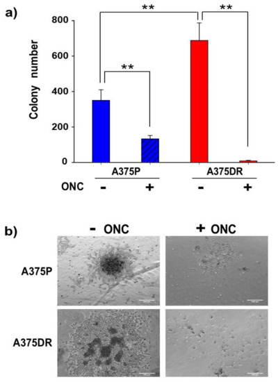 ONC effect on the colony formation of the two A375 cell subpopulations. (a) Number of colonies produced in soft agar by A375P (blue bars) and A375DR (red bars) cells after 72 h incubation with or without 1 µM ONC. After ONC treatment, cells were detached, counted, and cultured for 21 days in the medium containing 0.6% agar. Data reported are relative to three independent replicates ± S.D. All differences detected were statistically significant, ** p < 0.01; and (b) Representative images of the colonies formed by A375P and A375DR cells in the presence or absence of ONC. 10× magnification images were taken with a Zeiss Axio Vert. A1 AxioCAM/cm−1 60N-C1”camera.