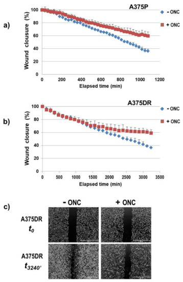 A wound-healing assay was performed to measure the cell migration ability of both A375P and A375DR subpopulations in the presence or absence of ONC. Notably, the time necessary to close the wound was different: In particular, A375DR cells migrated and proliferated more slowly than the A375P counterpart. Indeed, 1 µM ONC remarkably reduced the migration rate either of A375P or of A375DR cells, as is visible in Figure 6a,b, respectively. The c panel of Figure 6 shows instead the frames recorded either at the beginning or at the end of the test performed with ONC-free or ONC-treated A375DR cells.