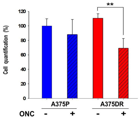 ONC effect on the invasion potential of the two A375 cell subpopulations. A375P (blue bars) and A375DR (red bars) cells treated (diagonal hatched bars), or not (no hatching) with 1 µM ONC for 72 h. Then, cells were detached, counted and seeded in a Transwell plate. After 48 h, they were stained and quantified in the Tecan NanoQuant Infinite M200 Pro Plate reader, as reported in the Materials and Methods Section. ** p < 0.01, ONC-treated versus ONC-free A375DR cells. The other differences were not statistically significant.