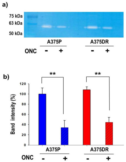 Both subpopulations were cultured for 48 h with or without 1 µM ONC. Thereafter, cells were serum-starved for 30 h and the conditioned media collected to measure the MMP2 activity by gelatin zymography. The results shown in Figure 8a,b demonstrate that ONC decreases MMP2 activity at a similar and remarkable extent either in A375P or in A375DR cells (p = 0.001 and p = 0.0006 for A375P and A375DR, respectively).