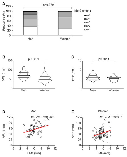 In our cohort of patients with at least one MetS criterion, men were characterized by greater VFth and EFth (p-value < 0.001 and 0.014, respectively) as compared to women (Figure 1B,C). However, only in women, VFth and EFth significantly correlated with each other (r = 0.303; p = 0.013) (Figure 1D,E).