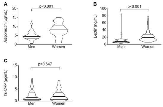 Conversely, women showed increased levels of adiponectin and leptin (p-value < 0.001 for both; Figure 2A,B), whereas the concentrations of hs-CRP were similar across sex (Figure 2C).