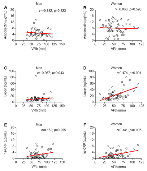 Conversely, the adipocytokine leptin correlated with VFth both in men and women (p = 0.043 and < 0.001, respectively) (Figure 3C,D). Hs-CRP correlated with VFth only in women (r = 0.341; p = 0.005) (Figure 3E,F). Considering EFth, no correlation between serum adiponectin and this variable was observed in both men and women (Figure 4A,B).