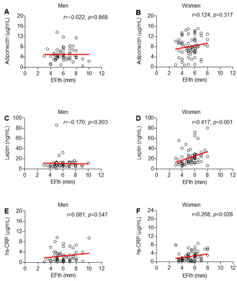 Only in women, significant correlations between EFth and leptin (r = 0.417; p < 0.001) and hs-CRP (r = 0.268; p = 0.028) were demonstrated (Figure 4C–F).