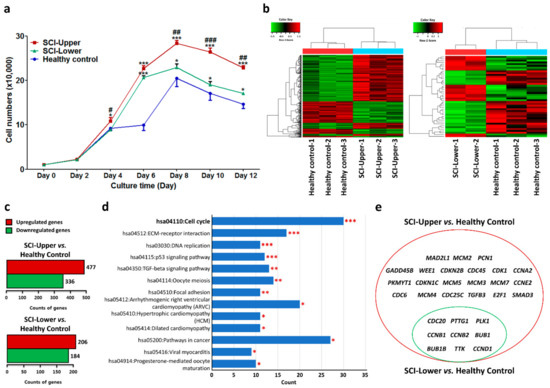 Gene expression profile by transcriptome analysis in spinal cord injury (SCI) patients and healthy subjects. (a) Line graphs show cell numbers of fibroblasts from SCI patients and healthy subjects from day 0 to 12 at passage 4. Blue line represents fibroblasts from healthy subjects (indicated as healthy control, n = 9), red line represents fibroblasts from deltoid muscle (indicated as SCI-Upper, n = 9), and green line represents fibroblasts from quadriceps muscle (indicated as SCI-Lower, n = 6). * p < 0.05 and *** p < 0.001 comparison with healthy control, and # p < 0.05, ## p < 0.01, and ### p < 0.001 comparison with the SCI-Lower from one-way analysis of variance followed by Bonferroni post hoc test. (b) Heat map of differentially expressed genes in the fibroblasts from SCI-Upper (n = 3) compared to healthy control (n = 3) (left panel) and in the fibroblasts from SCI-Lower (n = 2) compared to healthy control (right panel). The two-way hierarchical clustering method was used to normalize the value, and the relative expression level of the samples is indicated by color key and z-score. High expression levels are represented as red and low levels are represented as green. (c) Bar graphs show the number of differentially expressed genes with fold change ≥ |2.0| in the fibroblasts from SCI-Upper compared to healthy control (upper graph) and from SCI-Lower compared to healthy control (lower graph). Red bar represents upregulated genes and green bar represents downregulated genes. (d) Kyoto Encyclopedia of Genes and Genomes pathway analyses of the differentially expressed genes in the fibroblasts from SCI-Upper compared to healthy control. Significant terms (* p < 0.05, ** p < 0.01, and *** p < 0.001) are highlighted in red. (e) The Venn diagrams show the differentially expressed genes for the cell cycle pathway between SCI-Upper compared to healthy control (represented as red circle) and SCI-Lower compared to healthy control (represented as green circle).
