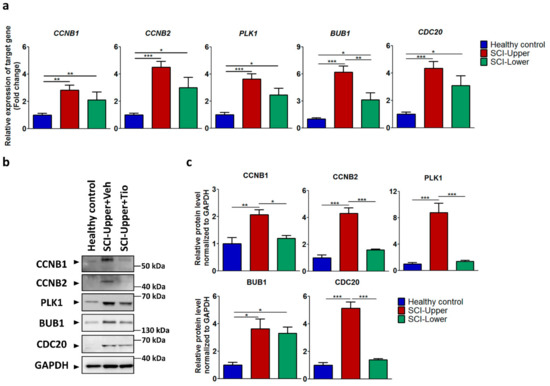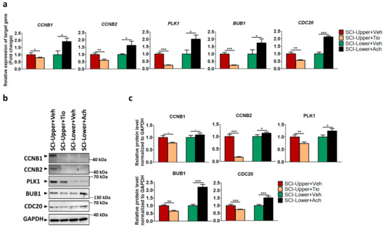 Next, the protein expression of CCNB1, CCNB2, PLK1, BUB1, and CDC20 was confirmed by Western blot (Figure 3b,c). In the SCI-Upper+Tio group compared with the SCI-Upper+Veh group, the expression of CCNB1 (p < 0.05), CCNB2 (p < 0.001), PLK1 (p < 0.01), BUB1 (p < 0.01), and CDC20 (p < 0.001) was significantly decreased. However, in the SCI-Lower+Ach group compared with the SCI-Lower+Veh group, the expression of CCNB1 (p < 0.05), CCNB2 (p < 0.05), PLK1 (p < 0.05), BUB1 (p < 0.001), and CDC20 (p < 0.001) was significantly increased. The protein expression ratios are presented in Table S5. These results suggest that cell cycle activation was modulated via the parasympathetic effect in patients with SCI.
