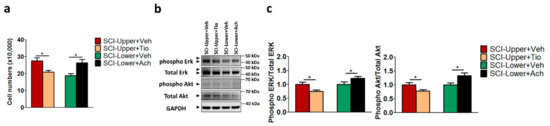 Furthermore, we investigated the ERK and AKT pathways, which have been reported to play an important role in the regulation of growth and proliferation [17] by Western blot analysis (Figure 4b,c). The expression of phosphorylated Erk/Total Erk and phosphorylated Akt/Total Akt was significantly decreased in the SCI-Upper+Tio group compared with the SCI-Upper+Veh group (p < 0.05 and p < 0.05, respectively). However, the expression of phosphorylated Erk/Total Erk and phosphorylated Akt/Total Akt was significantly increased in the SCI-Lower+Ach group compared with the SCI-Lower+Veh group (p < 0.05 and p < 0.05, respectively). The protein expression ratios are presented in Table S6. These results suggest that cell proliferation was modulated via the parasympathetic effect in patients with SCI.