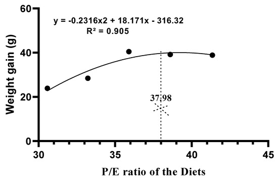 Second-order polynomial-regression analysis of the weight gain of Chinese perch fed with diets with different P/E ratios.
