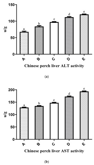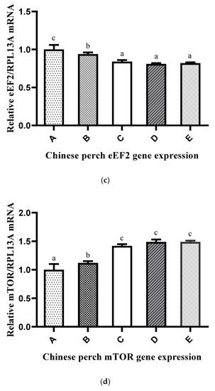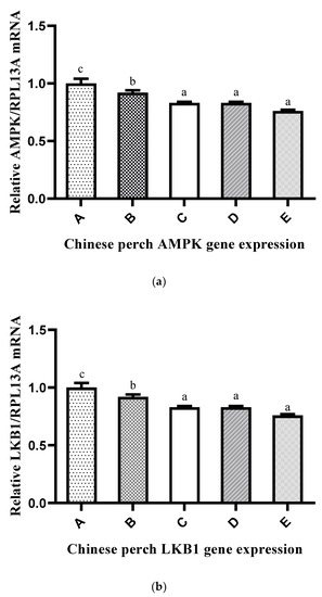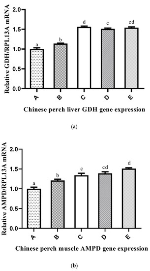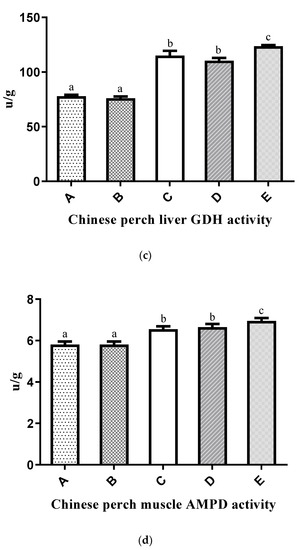 The mRNA expression levels of nitrogen metabolism genes (GDH and AMPD) in the liver and muscle of Chinese perch are shown in Figure 3a,b. The GDH expression level was significantly higher in Group C and lower in Group A compared with those of the other groups. The AMPD expression level in the muscle was significantly lower in Group A and significantly higher in Group E when compared with those in the other groups.