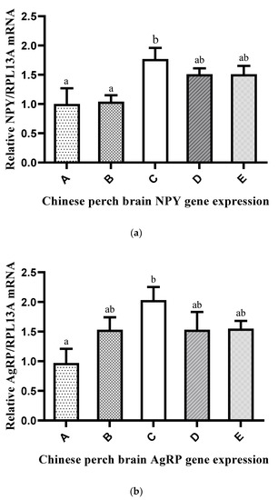 Feed intake was significantly higher in groups that were fed high P/E ratio diets compared with those fed low P/E ratio diets. Usually, feed intake regulation in fish depends on their metabolizable energy demands [54,65,66]. Similarly, if a diet is deficient in an essential nutrient, the fish tries to consume more feed to fulfill the demands for the specific nutrient [67]. Sá et al. (2014) [67] reported that low-protein diets were poorly digestible. The hypothalamus controls food intake either by appetite regulation or by receptors at both the transcriptional and translational level [68,69,70]. The hypothalamus contains two major kinds of neurons that regulate and integrate metabolic and endocrine signals related to food intake and energy homeostasis: one is the appetite-stimulating (orexigenic) neuron that co-expresses neuropeptide Y (NPY) and Agouti-related peptide (AgRP) [71], and the other is the appetite-suppressing (anorexigenic) neuron that co-expresses pro-opiomelanocortin (POMC) and cocaine- and amphetamine-regulated transcript (CART) [72]. In the present study, the mRNA expression of the NPY and AgRp genes was significantly affected by the dietary P/E ratio of the experimental diets. The gene expression level linearly increased with the increasing P/E ratio in the diets. The highest gene expression was found in Group C, followed by Groups D and E. However, the expression of the POMC and CART genes was not significantly affected by the P/E ratio in the experimental diets. This indicates that Chinese perch use high dietary protein for energy and body homeostasis regulation. Similarly, in Groups A and B, the protein level was below the optimal level, which could be the reason for the low feed intake and acceptability; that is, the feed was low in dietary protein and high in carbohydrates/lipids.