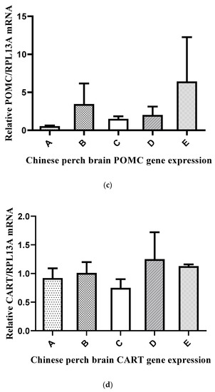 Effects of different P/E ratio diets on the mRNA expression of appetite regulation genes in Chinese perch: (a) NPY, (b) AgRP, (c) POMC, and (d) CART. The x-axis shows different groups (A–E) of experimental diets, and the y-axis shows the gene expression level. Vertical bars with lowercase letters represent a significant difference between treatments (p < 0.05).