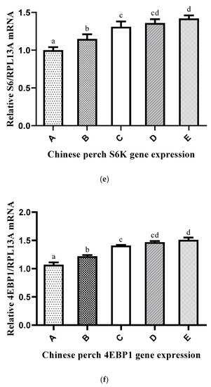 Effects of different P/E ratio diets on the mRNA expression of AMPK and mTOR pathway genes in Chinese perch: (a) AMPK, (b) LKB1, (c) eEF2, (d) mTOR, (e) S6K, and (f) 4EBP1. The x-axis shows different groups of experimental diets, and the y-axis shows the gene expression level. Vertical bars with lowercase letters represent a significant difference between treatments (p < 0.05).