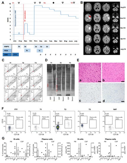 Interestingly, compared to previous findings from July 2018, we found new oligoclonal bands (OCB) (Figure 1D), indicating an activation of B cell/plasma cell mediated autoreactivity. Extensive pathogen and autoantibody diagnostics from CSF and serum were not conclusive. To ultimately exclude post-vaccinal YF encephalitis or progressive multifocal leukoencephalopathy, a brain biopsy (Figure 1E) with subsequent YF PCR was performed, and both were negative. Since repeated IVMPS treatment and immunoadsorption did not result in sufficient clinical improvement, the patient received NTZ (Figure 1A). Since then, clinical and MRI disease course improved significantly (EDSS score: 6.5, Figure 1A,B).