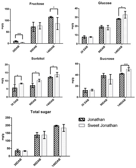 Content of individual sugar and sorbitol in apple fruit 30 days after bloom (30 DAB), 90 days (90 DAB) after bloom (90 DAB), and 140 days after bloom (140 DAB). * p-value < 0.05, *** p-value < 0.001. The error bar represents the standard deviation (SD) among the replicates.