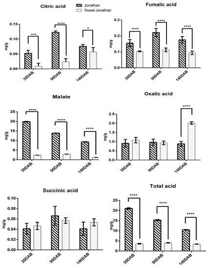 Content of acid in apple fruit 30 days after bloom (30 DAB), 90 days (90 DAB) after bloom, and 140 days after bloom (140 DAB). * p-value < 0.05, *** p-value < 0.001, **** p-value < 0.0001. The error bar represents the standard deviation (SD) among the replicates.