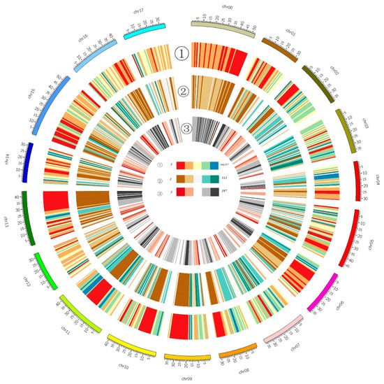 After variation analysis, a total of 4,198,955 SNPs and 319,494 InDels were identified between Jonathan and Sweet Jonathan (Table S3). The distribution of single nucleotide variants (SNVs) was not quite even across the genome (Figure 3 and Table S3). There was no significant correlation (p > 0.05) between the length of chromosomes and SNPs, InDels or SNVs, which is different from previous reports (Table S3). Functional annotation of SNVs suggested that more than 56% InDels and 68% SNPs were distributed in intergenic regions, whereas 2% InDels and 5% SNPs were annotated in exonic regions, and 1% InDels and 8% SNPs were located in upstream regions (or promoter regions) of genes (Table S4). A total of 5487 destructive mutations (frame shift InDels, stop gain and stop loss) were identified in the coding sequence (CDS) of 3,872 genes (Table S5).