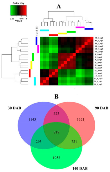 Hierarchical cluster analysis (A) based on the gene expression of all the samples and Venn diagram of differentially expressed genes at three stages between Jonathan and Sweet Jonathan (B). “J” (or “SJ”) represent the samples from Jonathan (or Sweet Jonathan) and the following number represents the different stages, 30, 90, and 140 days after bloom (30/90/140DAB).