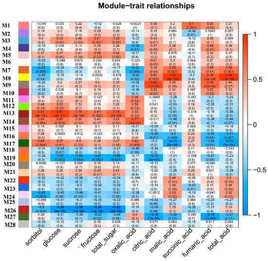 In order to decipher the internal regulation network, we performed weighted co-expression gene network analysis based on the expression dataset [18,19]. After filtering based on the expression and variation across all the samples, the 24,047 remaining genes fell into 28 co-expression modules (M1 to M28), and the number of genes harbored in co-expression modules ranged from nine to 12,732 (Figure 5). We related modules to sugar and acid traits to identify important hub genes. 14 co-expression modules were identified to be related to at least one sugar and acid trait during the fruit developmental stages. Among them, M13 and M26 were significantly related with all measured sugar traits (sorbitol, glucose, fructose, sucrose, and total sugar) (p-value < 0.01), and M19 was significantly associated with glucose, fructose, sucrose, and total sugar (p-value < 0.01) (Figure 6 and Table S17). Compared with other sugar and acid traits, sorbitol was significantly related to more co-expression modules (six) (p-value < 0.01) (Figure 6 and Table S16). As the major organic acid composition, four modules (M7, M8, M16, and M17) were detected to be significantly associated with the malate content (Figure 6 and Table S16). We also detected the following three substance-specific modules: M1, succinic acid; M4, fumaric acid; and M24, sorbitol (p-value < 0.01) (Table S16). Obviously, oxalic acid had different relationships with various modules as compared with other acids. The main reason to explain this is that there is a close relationship among citric acid, fumalic acid, malate, and succinic acid in the tricarboxylic acid cycle, except for the oxalic acid [20].