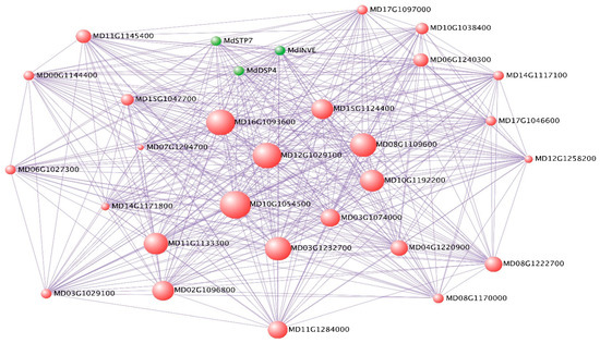 The sugar and acid in apple fruit may actively influence stress during fruit development. Sugars produced by photosynthesis not only fuel plant growth and development but may also act as signals to regulate plant growth and development, as well as plant stress. In this study, although there was no significant difference between the total sugar of Jonathan and Sweet Jonathan during fruit development, the important sugar components showed significant differences, for example, the sorbitol content in Sweet Jonathan was significantly higher than in Jonathan. Suppressing sorbitol synthesis could substantially alter the global expression profile of stress response genes in apple and influence disease resistance [12,17]. Here, in the sugar-associated modules, hub genes involved in sugar metabolism were identified, and basic genes associated with plant stress were enriched or were more abundant in the same module (Tables S17–S19 and S21), for example, M13 was associated with all five types of sugar components and, consistently, three genes (MdDSP4, MdSTP7, and MdINVE) associated with sugar accumulation were identified as huge genes; in the same module, MdNPR1, which is a key regulatory gene associated with the SA-pathway and disease resistance, exhibited significantly higher expression in Sweet Jonathan than in Jonathan, consistent with the fact that disease-resistance genes in Sweet Jonathan were more highly expressed during fruit development (Table S17). In M26, besides the higher abundance of the disease resistant genes, MdFER (MD04G1176400) with the third highest connectivity, encoding the FERONIA receptor-like kinase, was reported to participate in defense response to fungus (Table S18).