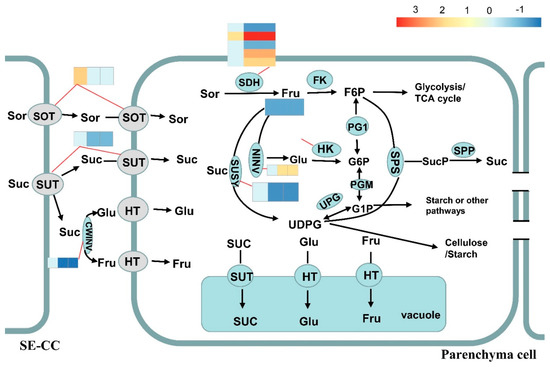 Heatmap shows the log2Foldchange (Sweet Jonathan vs. Jonathan) of the differentially expressed genes. Both sorbitol (Sor) and sucrose (Suc) are unloaded to the cell-wall space between the sieve element-companion cell complex (SE-CC) and parenchyma cells in fruit. Sor is taken up into parenchyma cells via a sorbitol transporter (SOT). Suc is directly transported into parenchyma cells by a plasma membrane-bound sucrose transporter (SUT) or is converted into fructose (Fru) and glucose (Glc) in the cell-wall space by cell-wall invertase (CWINV) and is then transported into the parenchyma cells by a hexose transporter (HT). In the cytosol, Sor is converted to Fru by sorbitol dehydrogenase (SDH), while Suc is converted to Fru and Glc by neutral invertase (NINV), or to Fru and UDP-glucose by sucrose synthase (SUSY). The resulting Glc and Fru can be phosphorylated to glucose 6-phsophate (G6P) and fructose 6-phosphate (F6P) by hexokinase (HK) and fructokinase (FK, specific for Fru). The conversions between F6P, G6P, G1P, and UDPG are catalyzed by phosphoglucoisomerase (PGI), phosphoglucomutase (PGM), and UDPG-pyrophosphorylase (UGP) in readily reversible reactions. The F6P produced in sugar metabolism enters the glycolysis/TCA cycle to generate energy and intermediates for other processes. G1P is used for starch synthesis. UDPG can be used for cellulose synthesis or combined with F6P for resynthesis of Suc via sucrose phosphate synthase (SPS) and sucrose-phosphatase (SPP). Most of the Fru, Glc, and Suc that have not been metabolized are transported by special tonoplast transporters into the vacuole for storage. Inside the vacuole, Suc converted into Glc and Fru by vacuolar acid invertase (vAINV).