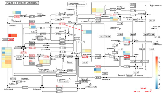 Starch and sucrose metabolism pathway. Heatmap shows the log2Foldchange (Sweet Jonathan vs. Jonathan) of the differentially expressed genes.
