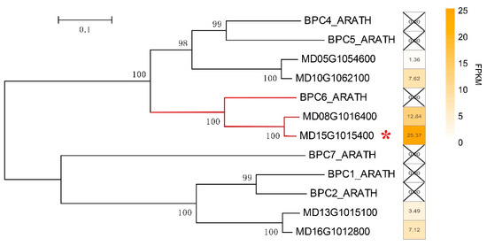 Phylogenetic analysis of the BPC gene family in the apple genome. The heatmap indicates the average fragments per kilobase of transcript per million mapped (FPKM) values of all samples. * the gene with the highest expression