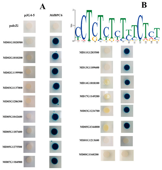 The GA-rich element of MdBPC6 binds to the promoter regions of 17 differentially expressed ABC transporters genes. Yeast one-hybrid assay validated that 15 of the 17 putative ABC transporters genes interacted with the MdBPC6 protein (Figure 11). The unvalidated two genes suggested that the MdBPC6 would not bind to the promoters of the two genes and the consensus motif should be false discovery.