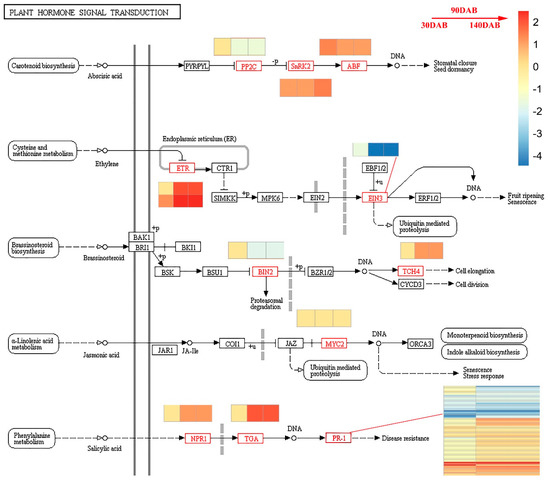 Plant hormone signal transduction is closely related to fruit development and plant stress. Here, differentially expressed genes were enriched in signal transduction GO terms, especially hormone signal transduction (p < 0.01) (Tables S11–S13). Fourteen DEGs and two DIGs were investigated in the plant hormone signal transduction pathway (mdm04075) (Table S27 and Figure 12). A series of successional DEGs in ABA and SA pathways were identified. One gene (MD11G1093100) in the ABA pathway encoding protein phosphatase 2C (PP2C; K14497), which negatively regulated serine/threonine-protein kinase SRK2, had significantly higher expression in Jonathan than in Sweet Jonathan, whereas MD04G1054400 encoding serine/threonine-protein kinase SRK2 and another gene (MD05G1027000) encoding an ABA responsive element binding factor had significantly higher expression in Sweet Jonathan. In the SA pathway, one gene (MD05G1256300) encoding regulatory protein NPR1 (K14508), which positively regulates transcription factor TGA (K14431), had significantly higher expression in Sweet Jonathan, and consistently, MD13G1044600, which encodes TGA, was upregulated in Sweet Jonathan (Table S27).