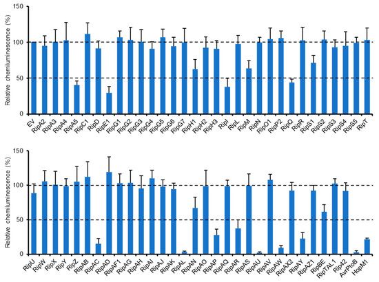 We previously identified a type III effector repertoire of R. solanacearum strain RS1000 [16] and constructed the binary vectors expressing effector genes under the control of a constitutive promoter [25]. To identify RS1000 effectors that affect plant PTI responses, we transiently expressed each effector protein in N. benthamiana leaves by agroinfiltration and evaluated its ability to suppress ROS burst triggered by flg22 treatment. Among the effector repertoire of RS1000, three effectors, namely, RipB, RipP1, and RipAA, were excluded from the screening because these effectors act as avirulence determinants and induce rapid effector-triggered immunity (ETI) responses in N. benthamiana [26]. In this screening, two type III effectors, AvrPtoB and HopM1, from Pto DC3000 with the ability to suppress PTI [13,14] were used as a positive control and an empty vector (EV) as a negative control. Out of the 61 Rip effectors tested, 11 (RipA5, RipE1, RipI, RipQ, RipAC, RipAL, RipAP, RipAR, RipAU, RipAW, and RipAY) strongly (≤50%) suppressed flg22-triggered ROS burst compared with the EV control (Figure 1). Among them, four effectors (RipAL, RipAR, RipAW, and RipAY) were previously shown to suppress plant PTI responses [19,21,23], indicating that our screening worked effectively. We also identified five effectors that weakly (51–70%) suppress ROS burst in N. benthamiana. By the screening, we identified a total of 16 effectors that affect flg22-triggered ROS burst.