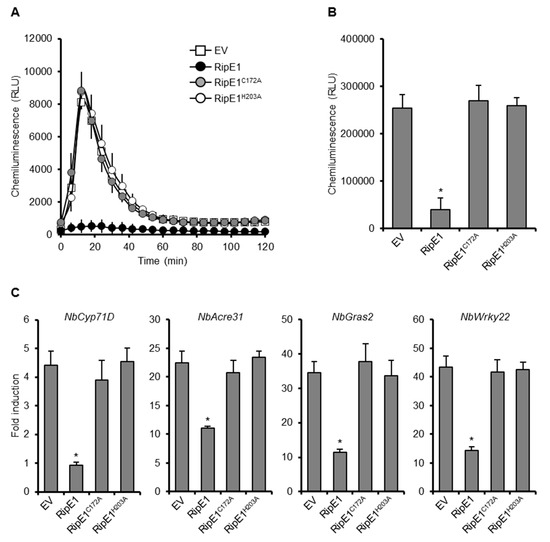 To clarify the role of the protease activity of RipE1 in PTI suppression, we transiently expressed HA-tagged RipE1, RipE1C172A, and RipE1H203A in N. benthamiana leaves by agroinfiltration. The expression of RipE1, but not those of RipE1C172A and RipE1H203A, suppressed the flg22-triggered ROS burst (Figure 2A,B) and the expressions of PTI marker genes (Figure 2C) compared with the EV control. We confirmed that the expression of RipE1 induced no visible changes in colors and ion leakage levels in the infiltrated leaves at least 3 days after agroinfiltration (Figure S2B,C). These findings show that RipE1 suppresses PTI through its cysteine protease activity.