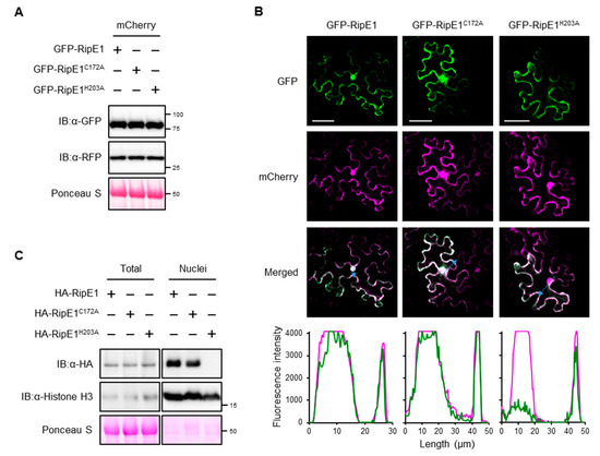 To examine the subcellular localization of RipE1 in plant cells, we constructed binary vectors expressing green fluorescent protein (GFP)-tagged RipE1, RipE1C172A, and RipE1H203A under the control of the β-estradiol-inducible promoter. When the GFP-RipE1 fusions were transiently coexpressed with the nucleocytoplasm marker mCherry in N. benthamiana leaves by agroinfiltration (Figure 3A), the fluorescence signals of GFP-RipE1, GFP-RipE1C172A, and GFP-RipE1H203A were observed in the cytoplasm of mesophyll cells as well as that of mCherry (Figure 3B). On the other hand, line-scanning analysis revealed that the fluorescence intensity of GFP-RipE1 or GFP-RipE1C172A, but not GFP-RipE1H203A, completely overlapped with that of mCherry in the nucleus. To verify this finding, we isolated total and nuclear protein fractions from N. benthamiana leaves expressing HA-tagged RipE1, RipE1C172A, and RipE1H203A and analyzed the accumulation levels of RipE1 and its mutants by immunoblotting. RipE1H203A was detected in the total fraction, but not in the nuclear fraction, whereas RipE1 and RipE1C172A were detected in both fractions (Figure 3C). These observations indicate that RipE1 localizes to the nucleocytoplasm of N. benthamiana cells and that the H203A mutation affects not only the protease activity but also the nuclear localization of RipE1.