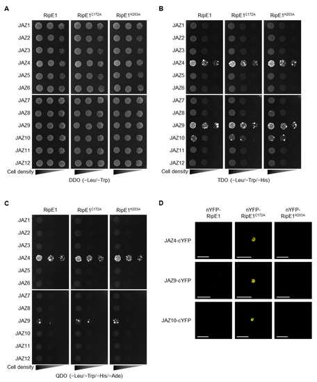 To identify plant proteins that interact with RipE1, we performed yeast two-hybrid screening using RipE1 as the bait. Yeast cells expressing ripE1 showed no significant difference in their growth (Figure 4A), indicating that RipE1 is not toxic to yeast cells. Upon screening approximately 2 × 106 transformants with an A. thaliana cDNA-derived prey library, we identified JAZ4 as a candidate plant target of RipE1. The JAZ family consists of 12 members in A. thaliana [4,29]. We examined the interaction of RipE1 with the JAZ proteins and found that RipE1 interacts with JAZ4, JAZ9, and JAZ10 in yeast cells (Figure 4B), particularly strongly with JAZ4 and JAZ9 (Figure 4C). The interaction with JAZ proteins was not affected by the C172A and H203A mutations of RipE1 (Figure 4B,C).