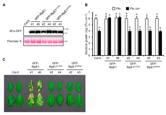 Pto DC3000, the causative agent of bacterial speck disease in tomato, could also infect A. thaliana. The A. thaliana–Pto interaction has been used as a model pathosystem for determining the contribution of effector proteins from other pathogens to virulence [21,24,32]. Therefore, we generated transgenic A. thaliana plants expressing GFP-RipE1, GFP-RipE1C172A, and GFP-RipE1H203A under the control of the β-estradiol-inducible promoter (Figure 6A). The growth of Pto in the transgenic plant leaves expressing GFP-RipE1 showed no significant difference compared with that in the parental Col-0 leaves (Figure 6B). Pto produces the phytotoxin COR, which is a functional mimic of JA-Ile that activates JA signaling to suppress SA-mediated defense responses in plants [6,11]. The growth of the COR-deficient mutant of Pto (Pto cor−) decreased 100-fold compared with that of the wild-type strain in the Col-0 leaves (Figure 6B). Notably, the growth of the Pto cor− mutant increased 100-fold and reached the wild-type level in the transgenic plants expressing GFP-RipE1, but not GFP-RipE1C172A and GFP-RipE1H203A compared with the parental Col-0 plants 2 days after inoculation. Moreover, the development of disease symptoms caused by Pto cor− was accelerated in the transgenic plant leaves expressing GFP-RipE1, but not GFP-RipE1C172A and GFP-RipE1H203A (Figure 6C). These observations indicate that RipE1 can complement the impaired virulence phenotype of Pto cor− through the activation of JA signaling.