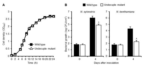 Generally, a single mutation in effector genes does not affect the virulence of plant pathogenic bacteria, probably owing to its functional redundancy among the effector repertoire. Therefore, we generated the undecuple mutant that lacks 11 effectors with a strong PTI suppression activity. Notably, the growth of the undecuple mutant was reduced in susceptible N. sylvestris leaves and extremely decreased in resistant N. benthamiana leaves (Figure 7). This finding clearly shows that Rip effectors with PTI suppression activity collectively promote the growth of R. solanacearum in plants. The greater inhibition of bacterial growth in resistant plants might be explained by the more rapid and stronger induction of defense responses in resistant plants. From another viewpoint, it has recently been suggested that one effector targets multiple plant factors to subvert immune responses. For example, the acetyltransferase effector HopZ1a from P. syringae degrades not only JAZ proteins but also GmHID1, which is involved in isoflavone biosynthesis [38,39]. Therefore, RipE1 or another effector(s) in the 11 effectors deleted in the undecuple mutant might suppress defense responses other than PTI, for example, ETI, in resistant plants. It would be interesting to determine whether any of the 11 effectors show the ability to affect ETI in N. benthamiana.