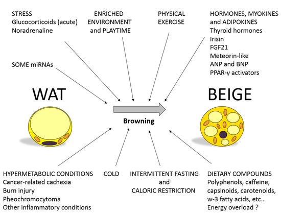 As explained in Figure 1, multiple factors have been related to browning activation in WAT [4], a negative energy balance being a common trait to many of them. Among the most relevant ones, this includes physical exercise, cold, stress hormones (noradrenaline and glucocorticoids), caloric restriction, and intermittent fasting. In this context, it has been speculated whether, in some cases, WAT browning is a negative adverse side effect given that it has been observed in severe-wasting situations such as burn-injured individuals, cancer-associated cachexia, or pheochromocytoma [9]. However, in general, the browning process is considered a promising strategy to revert the positive energy balance typical of obesity, and many studies have been devoted in the last years to study hormones, miRNAs, and physiological stimuli (i.e., physical activity and social stimulation) that are able to activate browning, including also dietary compounds that are involved in trans-differentiation from white to beige adipocytes.