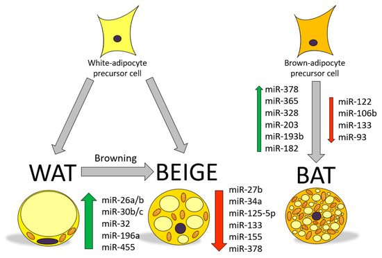 MicroRNAs involved in WAT browning and beige and brown adipocyte regulation. ↑, upregulated; ↓, downregulated.