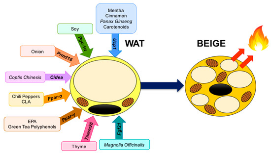 Evidence has shown that some food compounds could be promising candidates to target different molecular mechanisms and dietary strategies in the management of obesity, and, even more, some of them have the potential ability to promote the browning process in WAT. For instance, some of the most studied compounds are spices, green tea, polyunsaturated fatty acids (PUFA´s), carotenoids, and citrus fruits, among others.