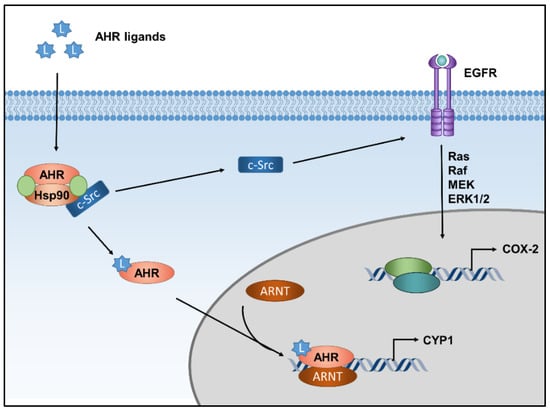 In the absence of a ligand, AHR is part of a cytosolic multiprotein complex, consisting of two heat-shock protein 90 molecules, the AHR-interacting protein and the co-chaperone p23 [12]. In addition, an association of the complex with the soluble tyrosine kinase c-Src is discussed [15]. Binding of a ligand to the AHR protein causes conformational changes that lead to a dissociation of the protein complex and the nuclear translocation of AHR. In the nucleus, AHR dimerizes with its partner protein AHR nuclear translocator (ARNT) and binds to xenobiotic-responsive elements in the enhancer region of target genes to recruit RNA polymerase II and induces their transcription (Figure 1) [12]. The prototype target gene, which is often regarded as a biomarker for the induction of AHR activity, encodes for the drug-metabolizing monooxygenase cytochrome P450 (CYP) 1A1 [13]. In addition to this so-called canonical AHR pathway, the ligand-driven dissociation of the cytosolic multiprotein complex may result in the activation of the tyrosine kinase c-Src, which subsequently can activate epidermal growth factor receptor (EGFR) and downstream mitogen-activated protein kinase (MAPK) signal transduction (Figure 1) [15,16,17].