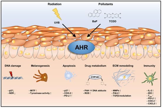 Cutaneous cellular effects in response to environmentally induced sustained AHR activation. Sustained activation of AHR by chronic exposure of the skin to either UVB radiation or chemical pollutants may affect a multitude of cellular processes that contribute to extrinsic skin aging and the development and progression of skin cancer.
