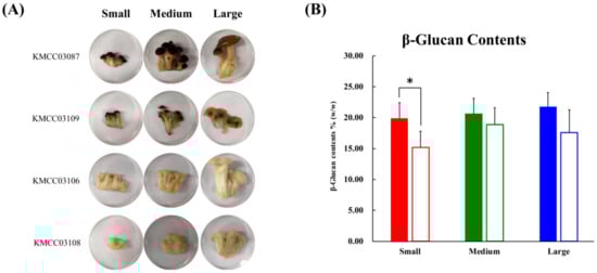 (A) Photographs of four beech mushrooms of different sizes. Developmental processes were divided according to three sizes: Small size; medium size; large size. (B) The graph represents the average β-glucan content. Data are represented as means ± S.D, with three biological replicates (n = 3) maintained for each of the four mushroom strains used in the study. Significant differences between the cap and stipe were identified by t-test (* p-value < 0.05). ■, cap parts; □, stipe parts.