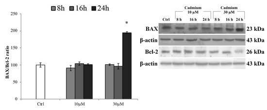 BAX and Bcl-2 protein expression levels. Representative western blot of the effects of CdCl2 (10 and 30 µM) on the protein levels of BAX and Bcl-2 after 8, 16, and 24 h of treatment. Bars represent the BAX/Bcl-2 ratio ± S.E.M., n = 9. Control condition was fixed at 100%; * p < 0.05 vs. control (untreated cells).